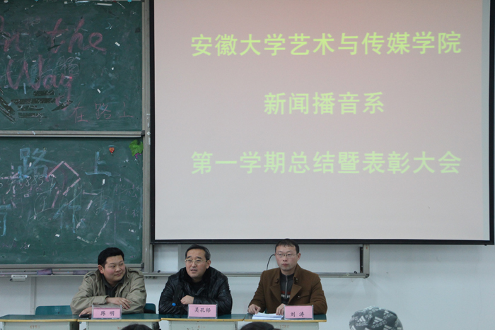 1月12日,新闻播音系学生会在1号教学楼第三阶梯教室成功召开了2014-2015学年度第一学期期末总结暨表彰大会,新闻播音系主任吴孔铎、院团委副书记陈明、系学管秘书刘涛老师出席会议,学生会全体成员参会。
