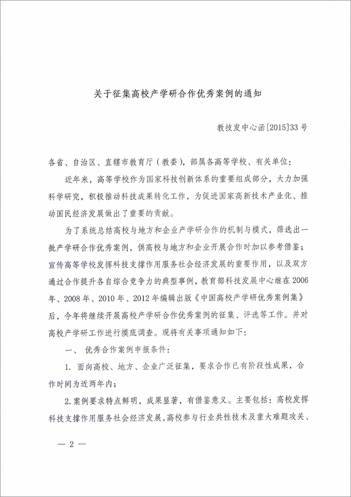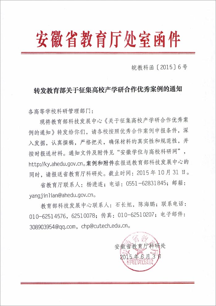 转发安徽省教育厅《转发教育部关于征集高校产学研合作优秀案例的通知》