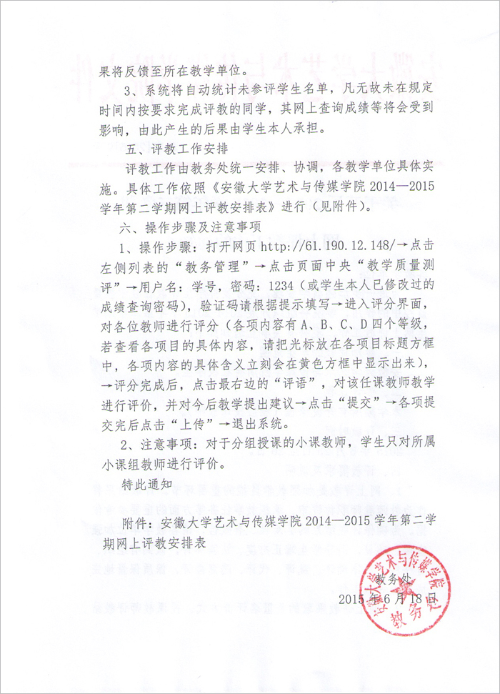 附件:安徽大学艺术与传媒学院2014—2015学年第二学期网上评教安排表.doc