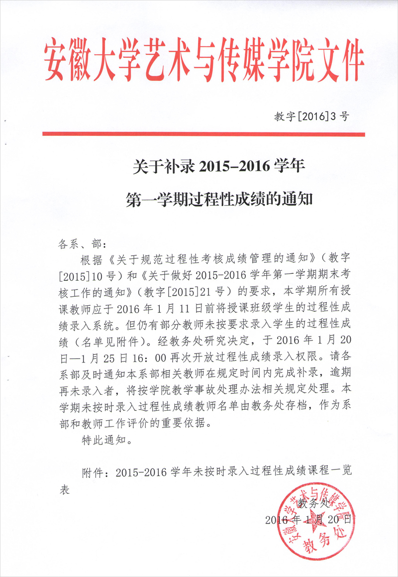 关于补录2015-2016学年第一学期过程性成绩的通知