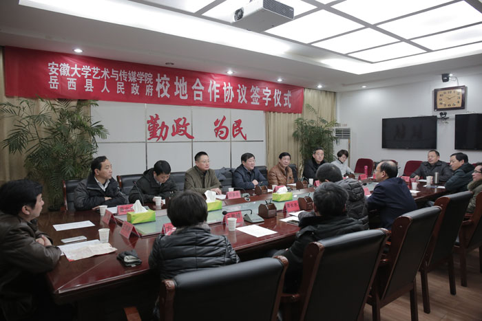 2月4日晚10点,学院与岳西县广电发展中心合作举办的岳西县2016年春节联欢晚会刚刚结束,安徽大学艺术与传媒学院与岳西县政府校政合作签字仪式在岳西县政府第一会议室举行。岳西县委副书记、代县长江春生,副县长黄长水,学院党委书记、院长周之虎,副院长张晶、郑善忠,学院综合办公室、教务处、音乐舞蹈系、戏剧影视系、新闻播音系、美术设计系、院团委,岳西县政府办、县委宣传部、文联、文化委、广电中心、旅游局等负责人出席签字仪式。岳西县副县长黄长水主持签字仪式。