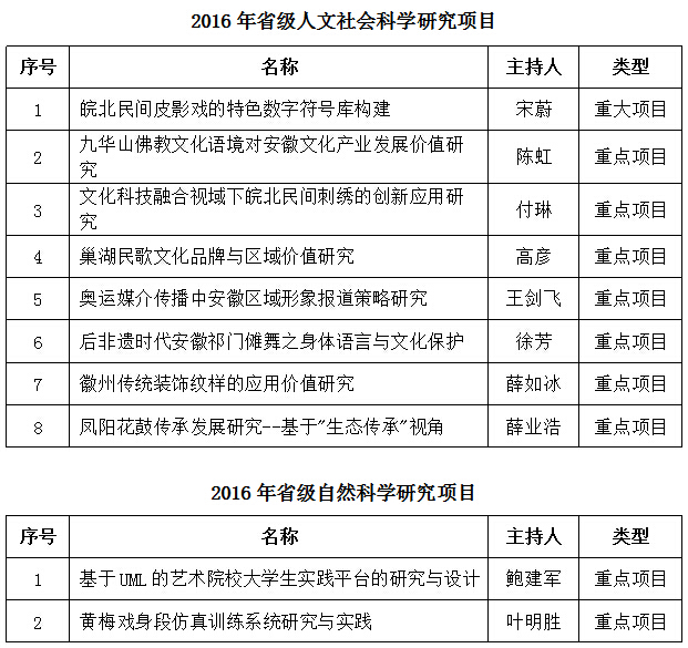近日,2016年度安徽省高校人文社会科学研究项目和自然科学研究项目立项结果揭晓,我院共有8项人文社科研究项目和2项自然科学研究项目获准立项,其中,1项人文社会科学重大项目,7项人文社会科学重点项目,2项自然科学重点项目。具体名单如下: