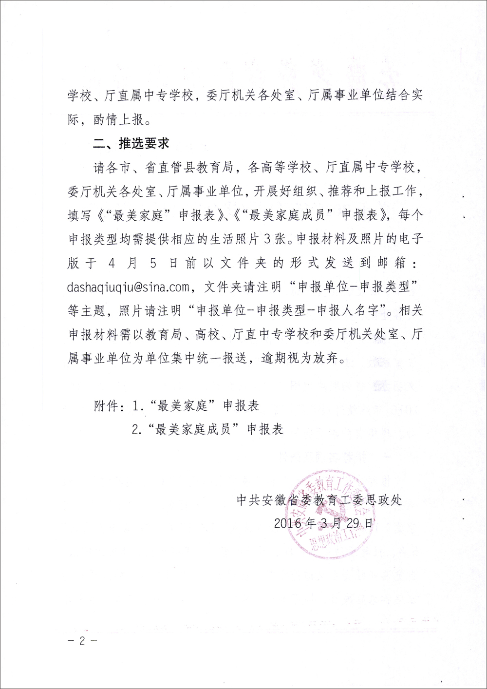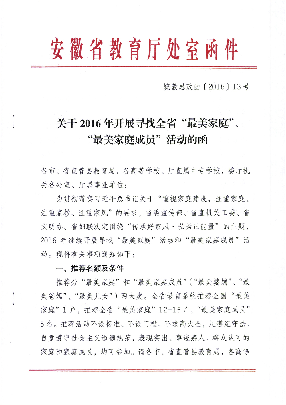 现转发《关于2016年开展寻找全省“最美家庭”、“最美家庭成员”活动的通知》皖教思政函〔2016〕13号,请按照通知要求,积极申报。申报材料及照片的电子档请于4月5日前以文件夹的形式发送至邮箱:771040816@qq.com.