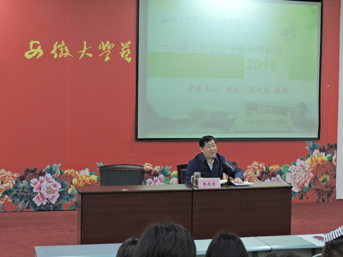 2016年4月28日晚,学院党委书记、院长周之虎教授为学院学生做了一场题为《十八届五中全会主要精神解读》的精彩报告。音乐舞蹈系的学生和院团委学生干部共计180多名学生济济一堂专注聆听了讲座。本次讲座由公共教学部组织。