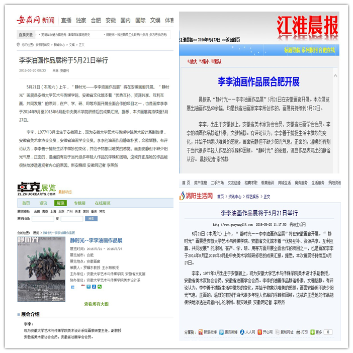 本次画展由安徽大学艺术与传媒学院、安徽省文化馆共同主办,安徽大学艺术与传媒学院美术设计系承办,是我院与安徽省文化馆本着“优势互补、资源共享、互利互赢、共同发展”原则,在产、学、研、用等方面开展全面合作的项目之一。展览共展出油画作品60余幅,是画家李李于2014年9月至2015年6月赴中央美术学院研修后的成果汇报。作品包括风景、人物肖像、静物等方面。“静时光”的命题,源自作品表现出的静谧从容。静,就是秉持初心、坚守本色。恰如早春的小草、初夏的繁花、暮秋的果实、严冬的荷塘,无论艳丽灰暗,还是厚重轻薄,皆体现自然物象、生命本真及其自有芳华,体现画家素雅内心与文化浸染的自然天成,以及对作品审美意象的心灵观照。(文:吴梦东)