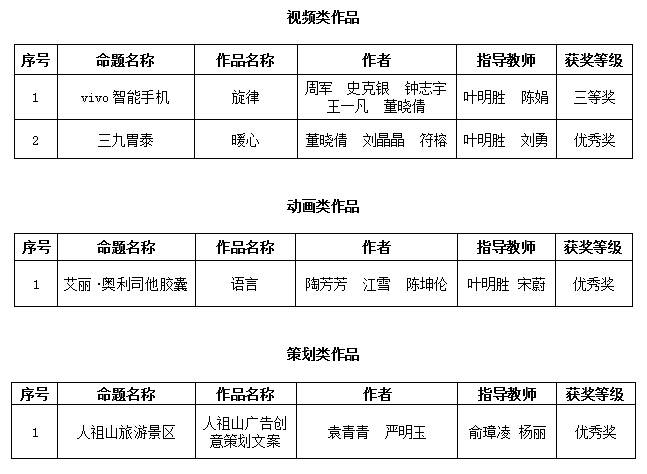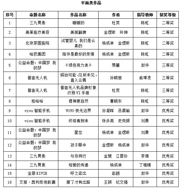 根据省教育厅皖教秘高﹝2016〕99号文件通知,我院学生在第八届全国大学生广告艺术大赛安徽省赛区获得佳绩,共获4个二等奖、5个三等奖、11个优胜奖等20个奖项。获奖名单如下: