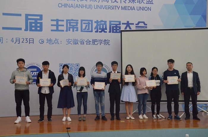 4月23日上午,中国(安徽)高校传媒联盟第二届主席团换届大会暨2017安徽高校新闻扶持计划颁奖大会在合肥学院成功举办。来自安徽省内40余所高校近200多位校媒同仁齐聚南艳湖畔,共同参加了此次大会。