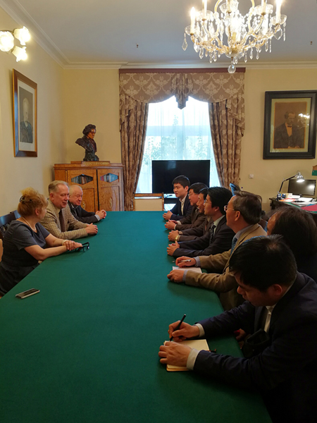 柴院院长索科洛夫(中)、分管外事副校长苏罕洛夫、分管教学副校长斯鲁茨卡娅会见访问团