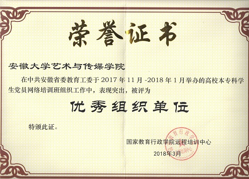 为贯彻落实习近平总书记“坚定不移全面从严治党”要求,进一步加强学院学生党建工作,在国家教育行政学院统一安排和安徽省教育工委协调指导下,学院于2017年11月-2018年1月举办的高校本专科学生党员网络培训班组织工作中,被评为“优秀组织单位”称号。
