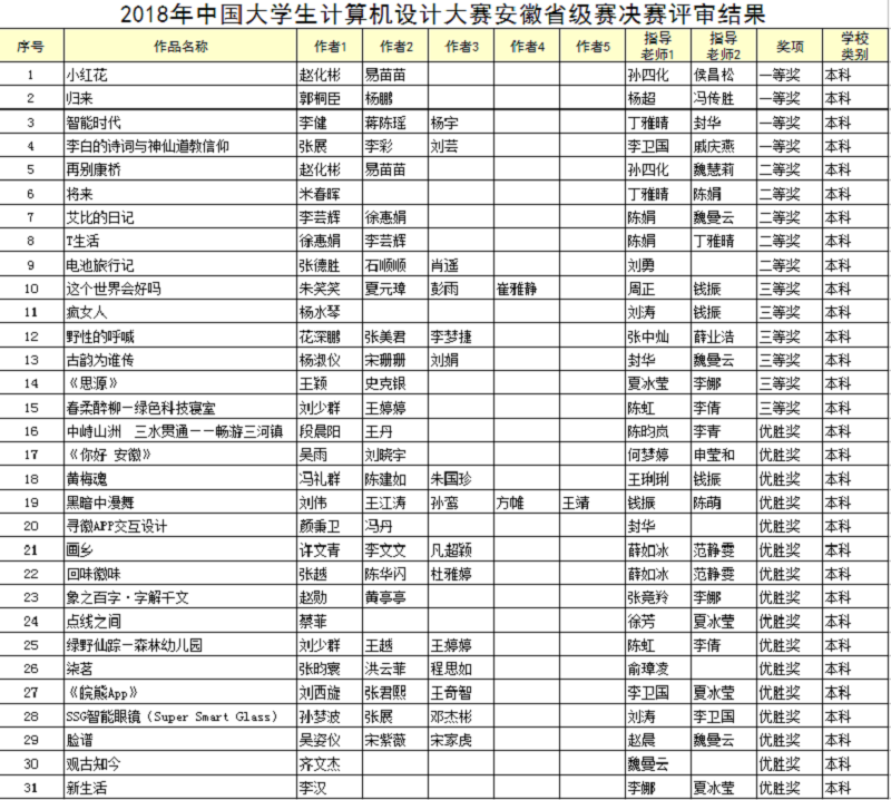 5月9日,根据“中国大学生计算机设计大赛安徽省级赛”官网评审结果公示,我院参加2018年中国大学生计算机设计大赛安徽省级赛的52件作品中,经大赛委员会组织省内外专家评审,再获佳绩。共获得4个一等奖、5个二等奖,6个三等奖、16个优胜奖。获奖名单如下: