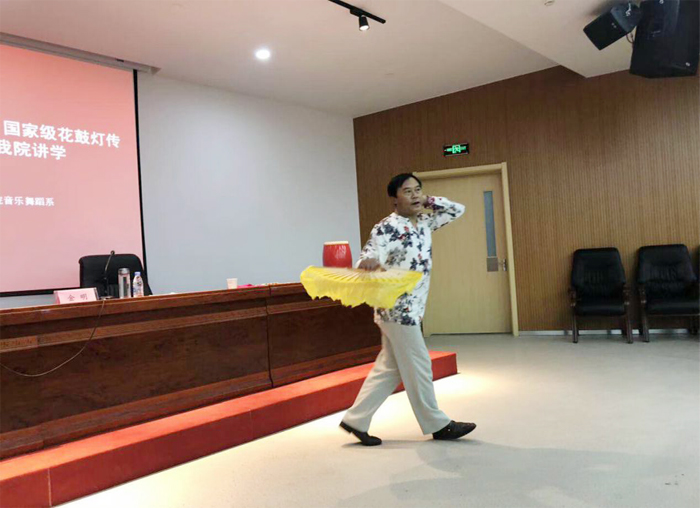 金明教授从1953年第一届全国民间音乐舞蹈汇演讲起,将花鼓灯的地域特征、文化背景、发展继承与时代创新等诸多方面作了全面梳理,为大家分享了自己独到的艺术理念与见解,并重点分析了以“返璞归真、追根溯源”为主要核心的民间舞专业课程发展建构思路。他指出,在花鼓灯的艺术实践中,既要尊重老前辈的文化经验,也要形成自己的独特艺术风格,推动形成安徽特色舞蹈艺术学科体系。金明教授表示,花鼓灯不仅是安徽省的舞蹈文化象征,更是全国汉民族舞蹈的优秀代表,正走向国际的非遗保护之路。随着民间文艺工作者一步步的寻根、挖掘,对花鼓灯研究的深入开展,花鼓灯从形式创新、时代特色上将更加鲜活,这对我省的舞蹈文化健康发展,具有重要意义。他还指出,艺术是不能弄虚作假的,执着的追寻艺术应该是流淌在血液里的情怀,是真正愿意用心血和生命来追求的。情到深处,金明教授拿起身边的扇子和鼓,为我们展示了花鼓灯的魅力。