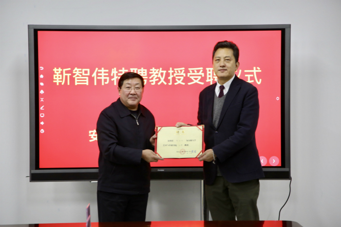 1月24日下午,智库机构国广市场调查(北京)有限公司首席研究员/总裁靳智伟正式受聘为我院特聘教授,受聘仪式在艺术设计楼会议室举行。学院党委书记、院长周之虎,党委副书记沈端良,副院长张晶,人事处及新闻播音系相关负责人参加受聘仪式。