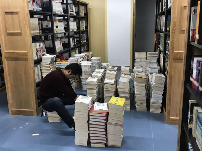 眼下,图书管理员主要进行书籍录入和书籍归位。管理员们有的盘腿坐在地上,将散落在周围的分散无序的书根据图书编目一本本整理好放并录入资料库;有的则不断在一排排书架间穿梭往返,将以录入的书归位、上架。30余万册图书,正是经由图书管理员的双手、经由这书尘中不断重复地扫码、上架,才各得其所、静待你我。