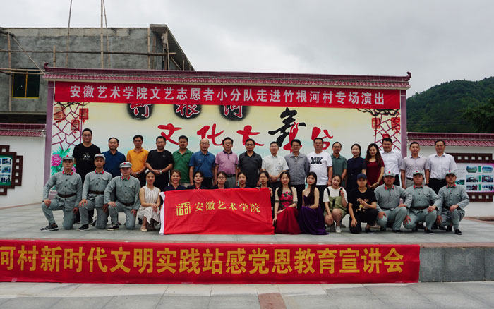 7月5日至7月10日,我院入围团中央全国“三下乡”重点团队的习近平新时代中国特色社会主义思想宣讲交流团和“深度贫困地区青春行”文艺志愿服务团一行26人在团委、学生处老师带领下赴六安市金寨县开展社会实践。团队先后赴古碑镇宋河村、燕子河镇杨树村、燕子河镇方坪村、吴家店镇竹根河村等地进行了主题为“颂歌献给党”的专场演出。演出以发源于大别山区的经典红歌《八月桂花遍地开》开篇,以大合唱《没有共产党就没有新中国》收尾,其间穿插器乐、舞蹈、小品、声乐节目,主题鲜明、形式多样、情感真挚,受到当地群众热烈欢迎。团队还根据各村实际,在演出中开展扶贫政策宣传、党的知识问答、感念党恩教育等活动,受到村委会高度肯定。团队先后参观了金寨县红军广场、燕子河镇文化站、红四军长征出发地,并和驻村扶贫干部、基层文化工作者开展多场交流活动。