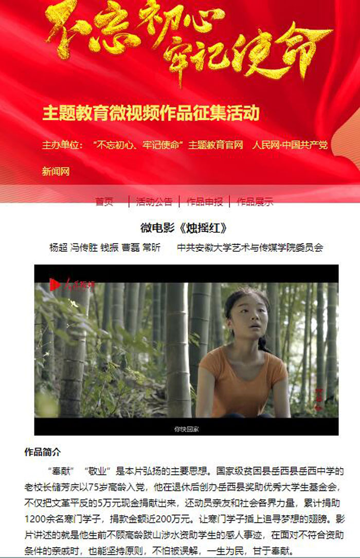 结合省委主题教育指导意见,学院先后围绕身边先进典型、当下校园生活以及本地历史文化名人包拯的相关经历等,创作并制作《烛摇红》《贷·价》《包拯与依法治国》等三部微电影,各自以小切口讲故事,或提炼生活日常或借古说今,在一个个典型化场景中突出初心与使命。9月13日,《烛摇红》《包拯与依法治国》两部微电影已在“守初心、担使命”微视频作品征集活动中通过官方审核,并在“不忘初心、牢记使命”主题教育官网、人民网·中国共产党新闻网展映。