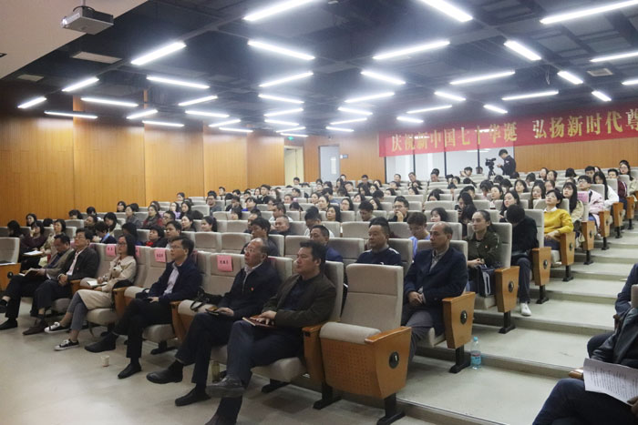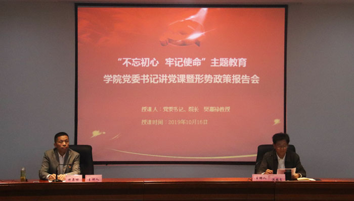 10月16日下午,学院“不忘初心、牢记使命”主题教育专题党课暨形势政策报告会在美术楼一楼报告厅举行。学院党政领导班子成员、中层以上党员干部(含助理)、各党总支委员、各党支部书记、全体教职工党员和部分学生党员参加会议,省委主题教育第十六巡回指导组成员到会指导,学院党委副书记沈端良主持会议。学院党委书记、院长、学院主题教育领导小组组长樊嘉禄以“坚守初心,勇于担当,努力办好人民满意的艺术学院”为题,为与会党员上了一堂生动的专题党课暨形势政策报告。