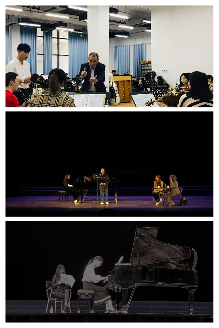下午,三个场次的公开课同时进行。让·伊夫·阿尔滕布格尔教授为学院青年交响乐团进行排练。他幽默风趣、通俗易懂的授课方式让乐手们能够根据演奏作品及时准确地掌握演奏要点,同时注重各乐器声部的协同。声乐公开课上,福洛伦丝·卡慈教授根据五位学生演唱的曲目,从音阶的处理、装饰音的色彩性表达、意大利语元音间的过渡、作品的二度创作等方面进行了指导。钢琴公开课上,张颖老师对我院学生的演奏给予了高度肯定与赞扬,并仔细指出了演奏中出现的问题,譬如该如何控制指尖与键盘的关系、踏板的使用、声部之间的比例关系等,授课过程轻松愉快,授课内容丰富实用。