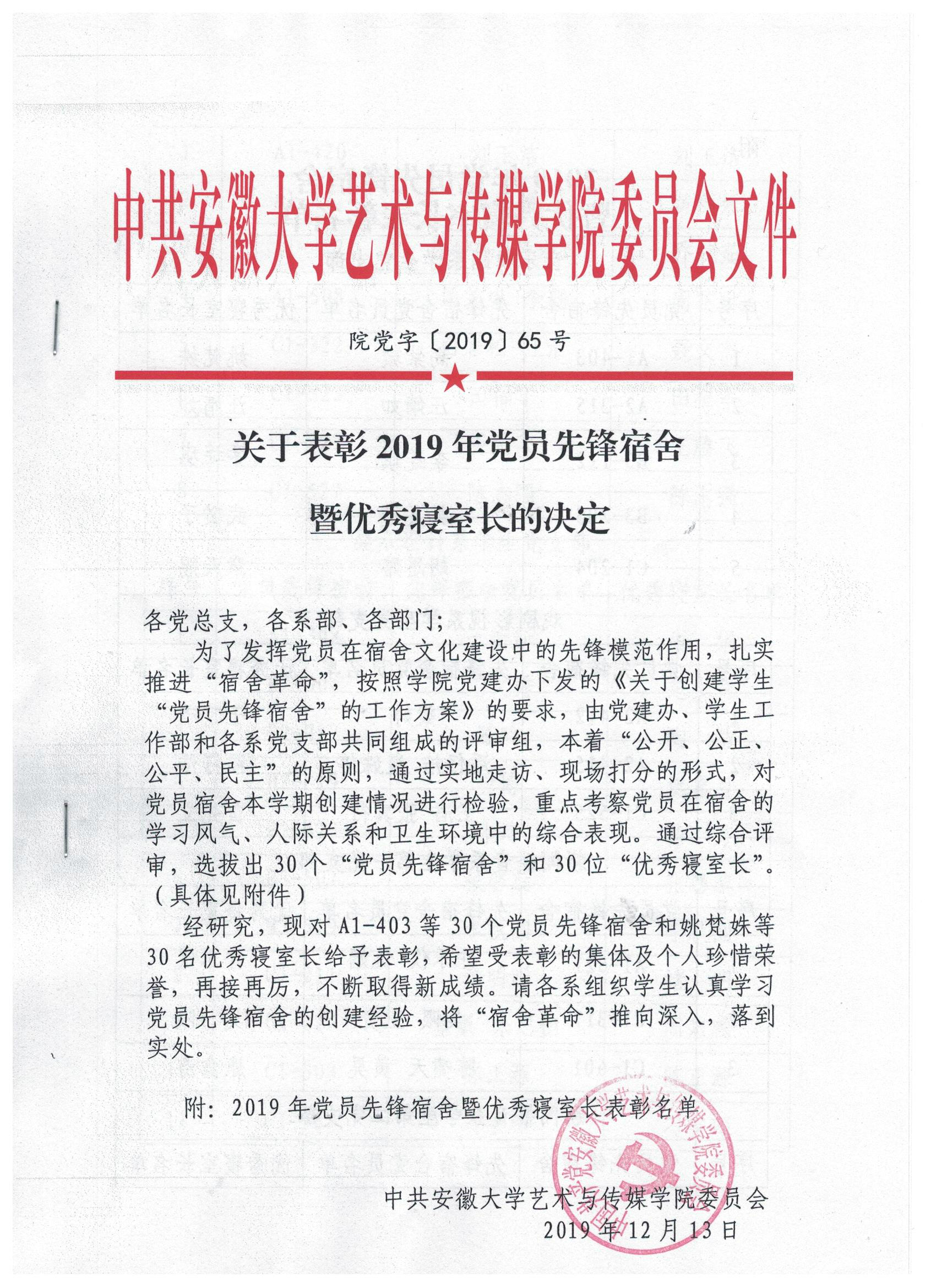 关于表彰2019年党员先锋宿舍暨优秀寝室长的决定