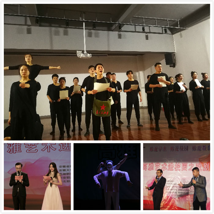 打开戏剧之门,感受高雅艺术。12月上旬至中旬,学院根据省教育厅工作安排,组建演出团队,分别赴芜湖、马鞍山、淮北、阜阳、淮南、六安等地职业技术学院,开展2019年高雅艺术进校园活动。