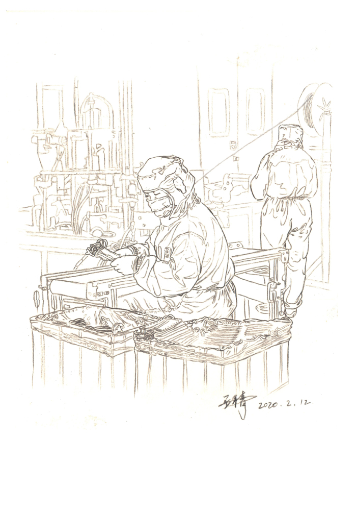 创作说明:本组速写捕捉了疫情中一些奋战在各岗位一线的感人瞬间,记录抗疫勇士。画面部分元素来源于网络照片。工具为碳铅和铅笔,侧重于以线条的变化展现画面主次关系和故事性。