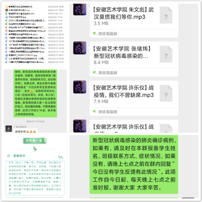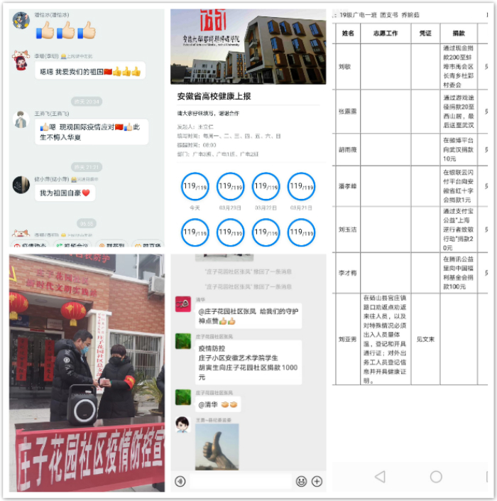 战“疫”打响以来,新闻播音系新入职辅导员丁翔心系学生安全,保证手机24小时畅通在线,通过电话、微信、QQ等方式,“一对一”“点对点”联系学生,掌握所有学生寒假去向、所在地,并对湖北回皖学生进行统计,精准摸排掌握每名学生每天的健康状况、思想状态和行动轨迹,坚持执行每日零报告制度,把防控阻击疫情的要求真正落实落细落到位。在学生微信群发布温馨提示、转发防疫知识、开辟防疫推送专栏,以不间断的“提醒”“督促”,传递来自学校与老师的关心关爱,让学生和家长多了一份安全感、踏实感。