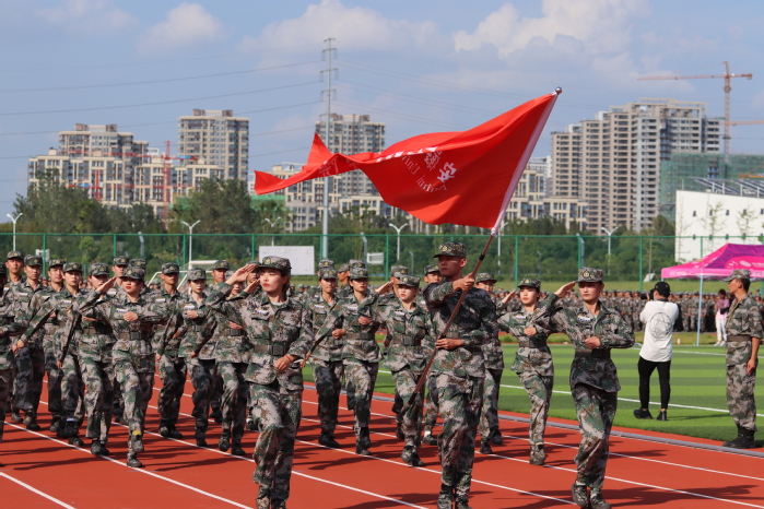 张晶教授勉励2020级新生新学期、新起点、新征途后,校旗方队身穿迷彩服擎着校旗、踢着正步庄重入场,拉开了军训汇报会的序幕。
