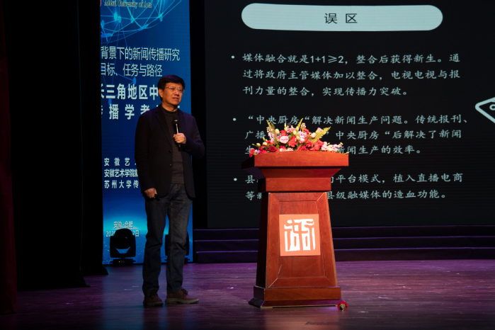 随后新闻播音系主任王琍琍教授主持主题演讲,苏州大学传媒学院执行院长陈龙教授、《新闻与传播研究》执行主编朱鸿军教授、CRIR国广市场调查公司总裁兼首席研究员靳智伟教授分别做了《回归效果本位:融媒体算法传播改革的几点思考》《媒介融合需要媒介思维》以及《新冠疫情期间大众传播的几点启示》等主题演讲。
