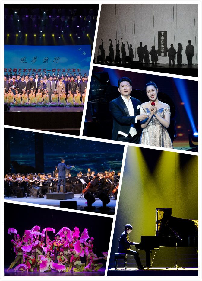 在欢快的旋律中,文艺演出拉开序幕,舞者翩翩而起,歌者放声歌唱,“举杯吧!朋友”,一句深情的咏叹,饱含着对未来的祝福。由四位来自安徽广播电视台的教师演绎的朗诵《开拓者》,赞美了安艺建设者筚路启山林、栉风砥砺行的创业精神,背景视频回顾了7年筹建之路的一个个重要时刻,时光的叙事让人感动。黄梅戏经典唱段《江山美景万年长》意境高远,我校黄梅戏专业教师、国家一级演员汪晓明扮相儒雅,功力深厚,获得阵阵掌声。原创花鼓灯舞蹈《花落花开》美轮美奂,讲述了花鼓灯艺术代代传承的故事,也展示着安艺人弘扬安徽艺术的担当。浪漫的灯光下,屡获国际钢琴比赛大奖的青年教师侯艺翔,为大家演奏了李斯特的作品《追雪》以及舒曼《狂欢节》选段,精湛技艺令人赞叹,悠扬琴声使人陶醉。男中音张祖顺和女高音宁艺轩演唱的二重唱《让我们携手同行》选自莫扎特的经典歌剧《唐璜》,两人表演生动,音色华丽,带领观众走进充满魅力的歌剧世界。原创花鼓灯舞蹈《希望的田野》聚焦小岗村村民“按红手印”的故事,用艺术记录时代,用作品讴歌人民,展现了安艺人的艺术价值追求。光影秀《追梦路上》通过美术专业学生的视角,讲述了学生眼中安艺一年来的变化,创意十足。由博业体育(中国)官方网站-登录入口交响乐团演奏的《加勒比随想曲》大气磅礴,抒发了安艺人向着星辰大海乘风破浪的豪情,国家一级演员孙来法教授随后在现场乐团伴奏下,深情演绎《再见了大别山》。演出最后,交响乐团和青年合唱团闪亮登场,一曲《布兰诗歌》气势恢宏,为安艺送上美好祝愿!“神州大地新时代凯歌高奏,锦绣江淮美画卷万象更新……”在热烈鼓舞的气氛中,文艺演出圆满结束。(撰稿:陈明 摄影:胡寅生 殷俊 审定:吴孔铎)