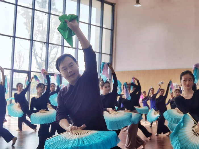 上午,金明在舞蹈楼进行实践课教学。我校20级舞蹈表演(专升本)全体学生、20级舞蹈表演班(本)男生及青年舞蹈教师参与此次大师实践课。实践课上,金明教授翥凤翔鸾,领着兰花时翾风回雪,领着鼓架子时发扬蹈厉,让参与大师实践课的师生大开眼界、受益匪浅。