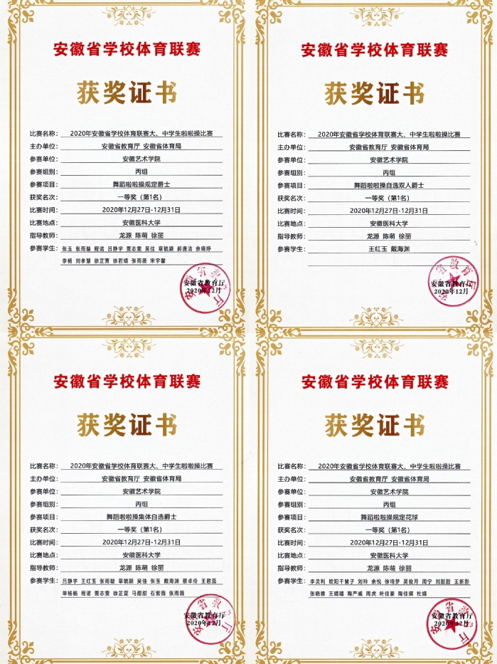 安徽省学校体育联赛由安徽省教育厅、安徽省体育局主办,由于疫情原因,2020年末此项比赛通过报送视频的方式进行,参赛队伍多达68支,参赛学生1520人次。同时,因今年赛制改革,我校纳入专业院校组,这对参赛师生来说无疑是增加了参赛难度,竞争十分激烈,但老师和同学们课余时间积极备战,刻苦训练,终于功夫不负有心人,我校成绩远超其他高校,4项第一的好成绩也是前所未有的突破。