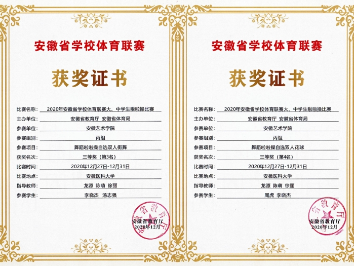近日,我校40余名师生在2020年安徽省学校体育联赛大、中学生啦啦操比赛中喜获4项一等奖(第一名)、2项三等奖的好成绩,学校荣获“体育道德风尚奖”,王红玉、叶佳豪两位同学荣获个人“体育道德风尚奖”。