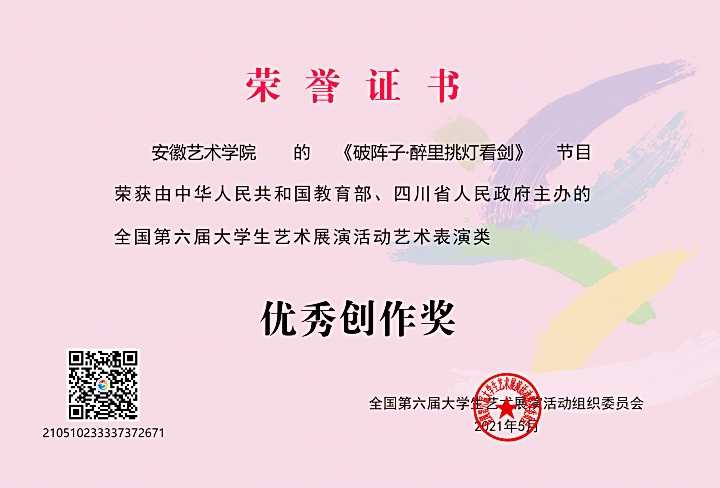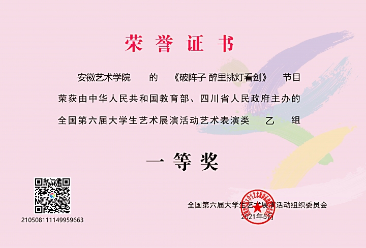 近日,由教育部主办的全国第六届大学生艺术展演活动艺术表演类节目评审结果揭晓,我校青年合唱团的合唱《破阵子·醉里挑灯看剑》获声乐类乙组(专业组)一等奖及优秀创作奖。