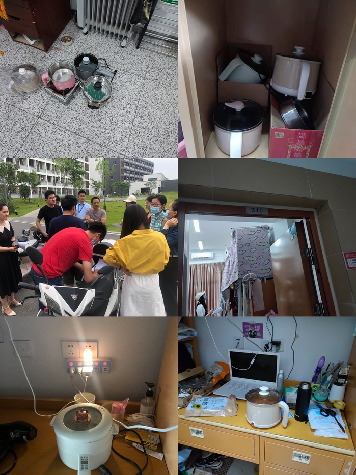 和上一次检查相比,宿舍安全情况大幅改善,只发现小部分宿舍违规使用小电饭锅十件左右,少数宿舍存在乱扯乱接插电板等现象。联合检查组当场没收违规电器,并对当事人进行批评教育。