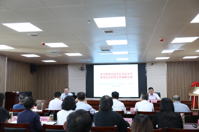 会后,洪永平围绕“学习贯彻习近平总书记关于哲学社会科学工作重要论述”,为全体参会人员作专题讲座。洪永平梳理了哲学社会科学发展的三个阶段,继而从地位论、本质论、任务论、学风论四个方面全面解读了习近平总书记关于哲学社会科学工作重要论述的丰富内涵。