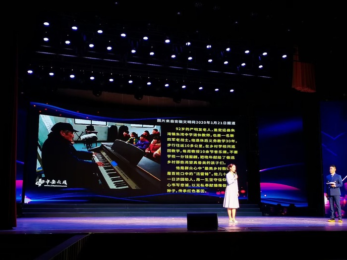 同样是朗诵,寿县小甸集特支第一任书记曹蕴真19岁时写下明志诗,辅以寿县小甸集特支纪念馆视频画面,以单人朗诵的方式慷慨呈现;而根据因公殉职的扶贫干部曾翙翔事迹原创的《星光飞翔》,则以分角色的方式,汇集了曾翙翔、曾妻、老同事、扶贫村村民等四位人物,既避免了第一人称视角的单薄,又得以全方位展示先进事迹,让收尾处的抒情有了扎实的叙事基础,演出现场催人泪下。