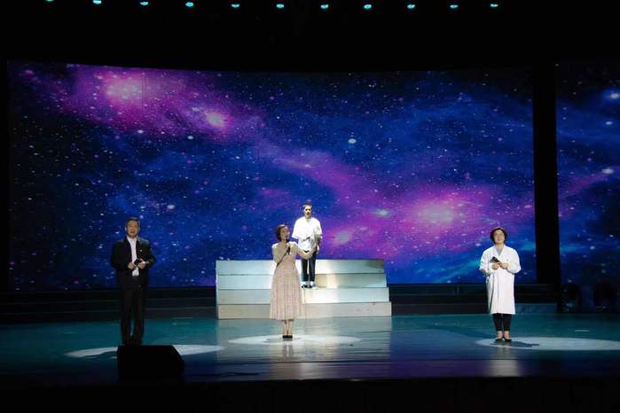 同样是朗诵,寿县小甸集特支第一任书记曹蕴真19岁时写下明志诗,辅以寿县小甸集特支纪念馆视频画面,以单人朗诵的方式慷慨呈现;而根据因公殉职的扶贫干部曾翙翔事迹原创的《星光飞翔》,则以分角色的方式,汇集了曾翙翔、曾妻、老同事、扶贫村村民等四位人物,既避免了第一人称视角的单薄,又得以全方位展示先进事迹,让收尾处的抒情有了扎实的叙事基础,演出现场催人泪下。