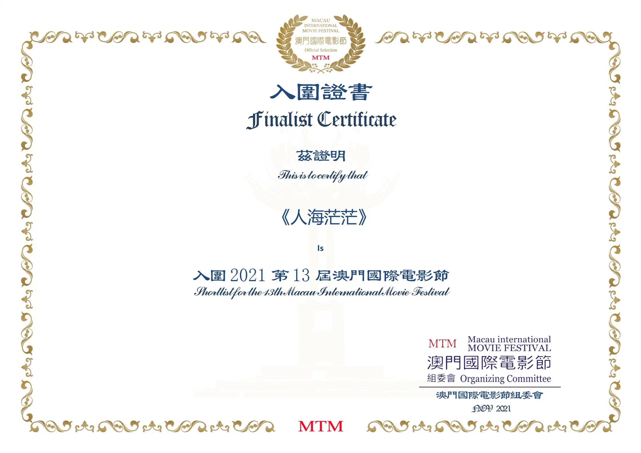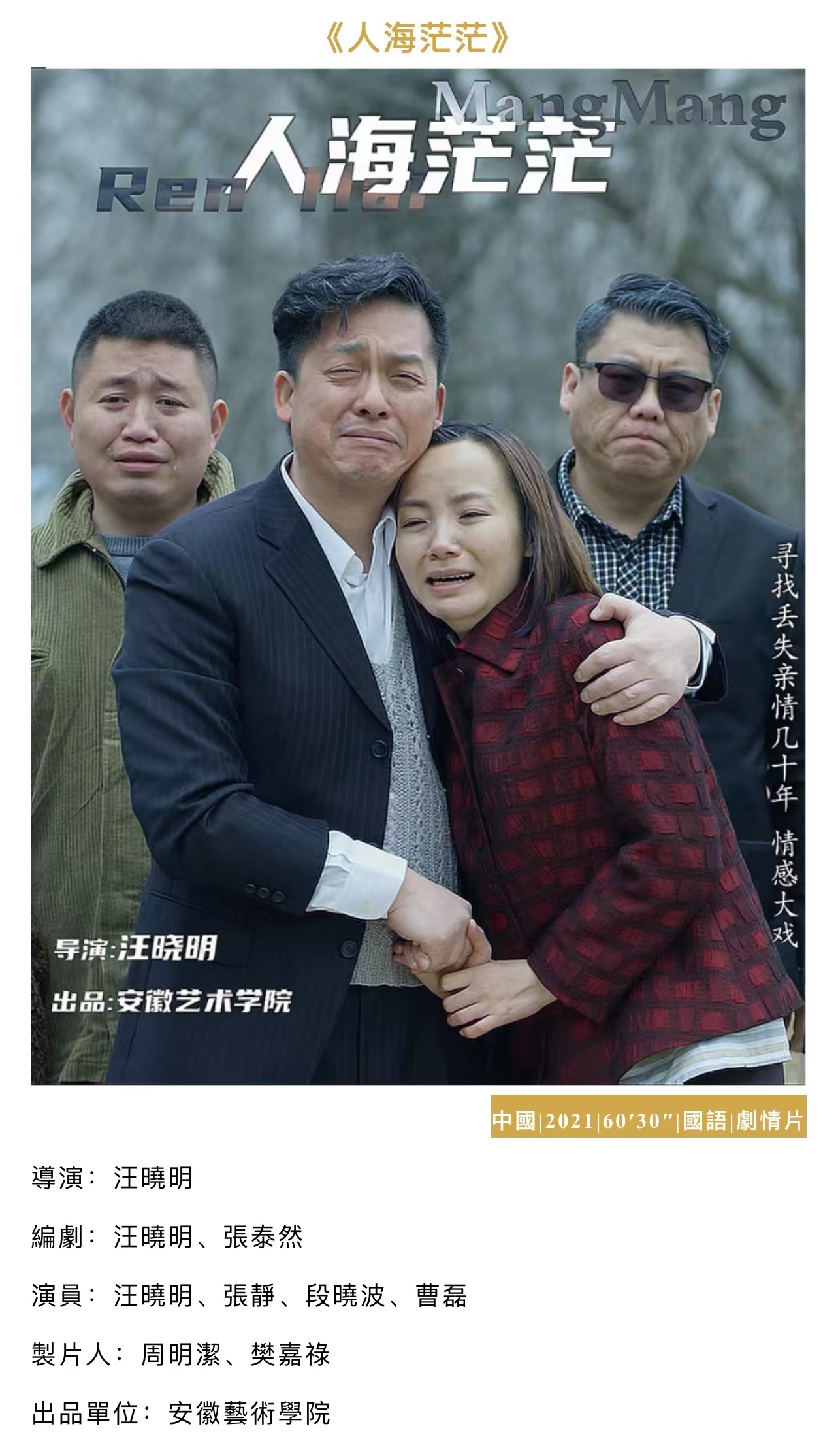 近日,2021年第13届澳门国际电影节入围奖正式出炉,我校影视中心汪晓明导演的原创电影《人海茫茫》成功入围。