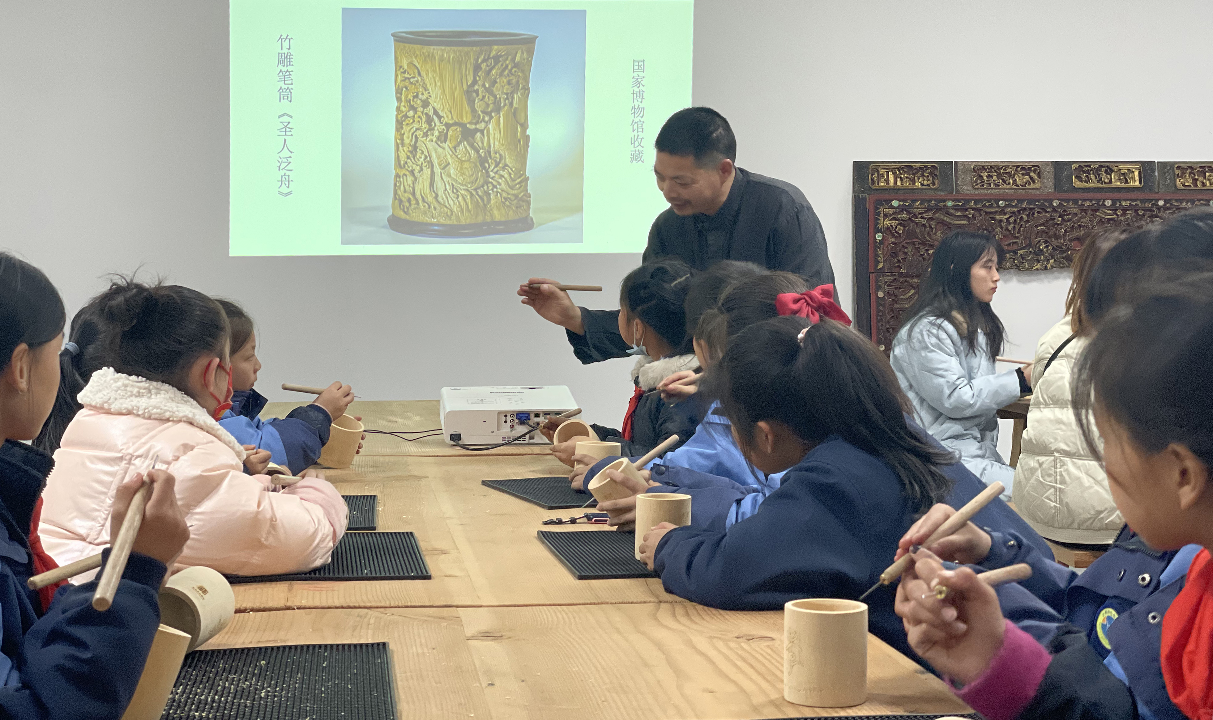12月1日下午,合肥市伦先小学数十名师生走进博业体育(中国)官方网站-登录入口中国非遗与乡村振兴设计研究院,在我校国家级非遗传承人洪建华老师的指导下,零距离感受传统文化“徽州竹雕”的魅力。