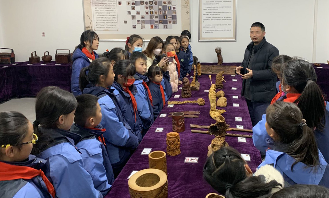 师生们参观徽州雕刻艺术品陈列馆。洪建华为大家科普了徽州竹雕的知识和研究现状,从器型审美、雕刻工艺和纹样内涵等角度分析了陈列馆藏品。小学生们兴奋不已,不时发出惊叹声。