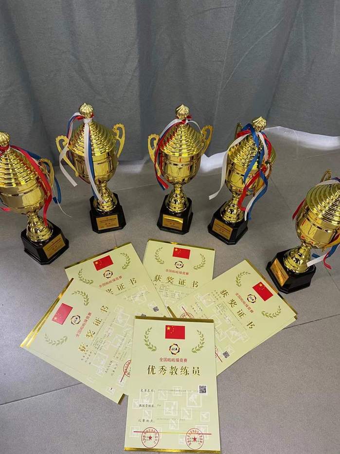 近日,在全国啦啦操联赛总决赛中,我校摘得全国啦啦操总决赛俱乐部青年甲组集体自选街舞、双人自选花球、双人自选街舞、双人自选爵士、集体自由舞蹈(道具组)五个项目的冠军奖杯。
