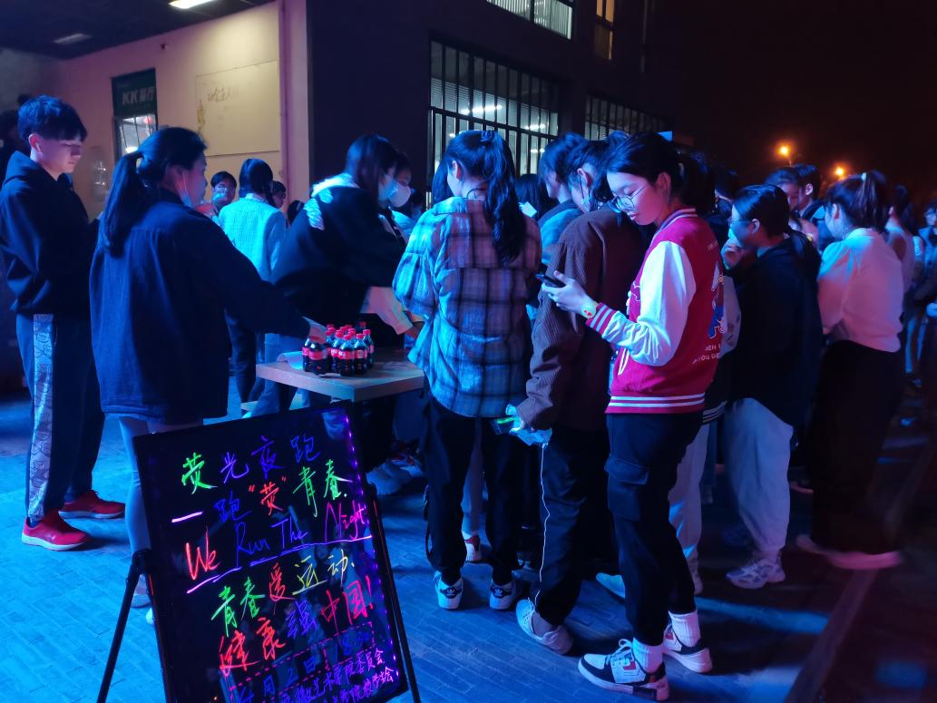 “跑‘荧’青春”就以校园二环线规划夜跑线路,全程设置8个打卡点。出发前,两位志愿者特地“开嗓”热场,一首《奇迹再现》成为起跑发令枪。几个打卡点后,夜幕笼罩,同学们佩戴的荧光手环随跑步摆臂高高低低地亮起,在并驱争先中好似校园里星辰闪烁。各个打卡点负责集卡盖章的同学们也不时挥舞荧光棒,给前来的同学们指引路线、鼓劲助威……