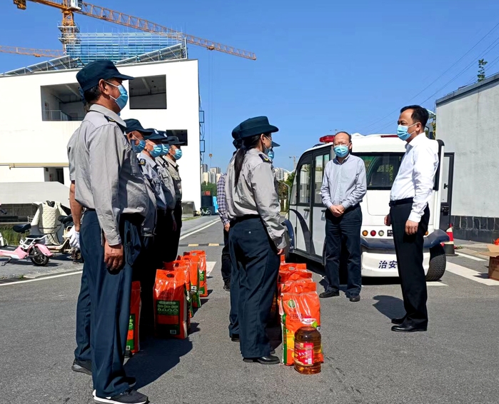 5月5日,校党委书记周明洁慰问疫情期间坚守岗位的安保人员,向他们发放慰问品。行政负责人程世锁陪同。