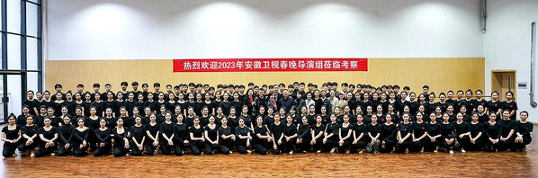 11月18日上午,安徽广播电视台文体中心总监葛晓,安徽卫视2023年春晚总导演胡明明、舞蹈总监姜洋、制片主任许平一行来校洽谈校青年舞团参演安徽卫视2023年春晚事宜。党委委员、副校长柳友荣参加接待。党委委员、办公室主任曹晓富,党委委员、宣传(统战)部部长王琍琍陪同。