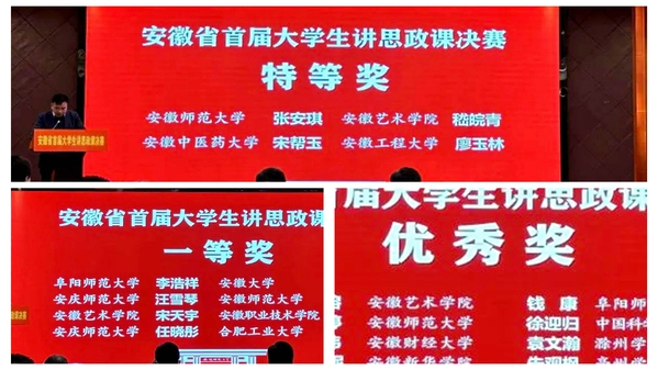 3月4日,安徽省首届以“青春献礼二十大,强国有我新征程”为主题的大学生讲思政课决赛圆满落幕在全省几十所高校的76组选手激烈竞争中,我校4组选手全部获奖,并喜获特等奖1项(全省仅4组)、一等奖1项(全省仅8组)、优秀奖1项、入围奖1项。