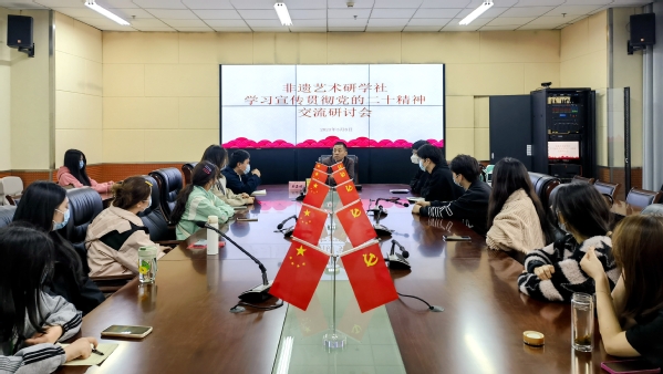 3月8日下午,党委副书记、校长樊嘉禄在设计楼四楼会议室与学校非遗艺术研学社的20多名社员围绕学习宣传贯彻党的二十大精神进行交流座谈。