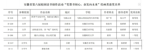 在首届安徽省大学生作品展中,美术学院共31名学生通过复评,获二等奖1人、三等奖3人;在第三届安徽省大学生绘画作品大赛中获一等奖2项、二等奖5项、三等奖8项;在安徽省第六届校园读书创作活动中,喜获特等奖2项、三等奖1项。