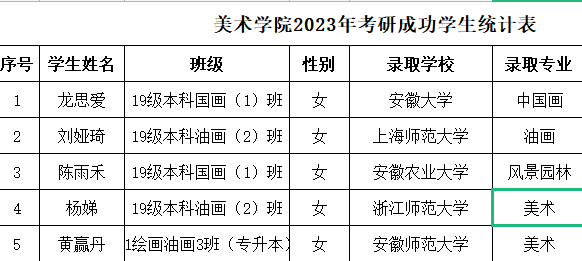 今年,美术学院毕业生考研再创佳绩,多人被安徽大学、安徽师范大学、上海师范大学等高校录取。