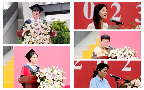 2023届毕业生依次登台,庄重地接受拨穗正冠。学生代表、教师代表、家长代表、行政及后勤管理人员代表分别发言,表达对未来的美好期望,对莘莘学子的殷切祝愿。
