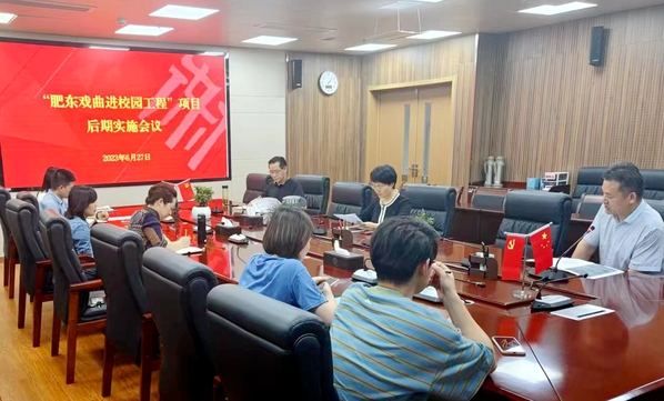 工会主席李胜汇报“肥东县戏曲进校园工程”项目进展及总体实施方案。四个子项目负责人分别汇报各自项目实施计划。科研处、财务处等职能部门对项目管理和财务管理给予指导。