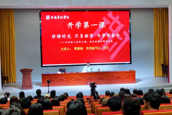 9月13日下午,党委副书记、校长樊嘉禄在综合楼5楼报告厅主会场以“珍惜时光 不负韶华 为梦想奋斗”为题给同学们讲授“开学第一课”。各二级学院设置分会场实时直播,全体师生同上“开学第一课”。校党政负责人沈端良主持“开学第一课”。